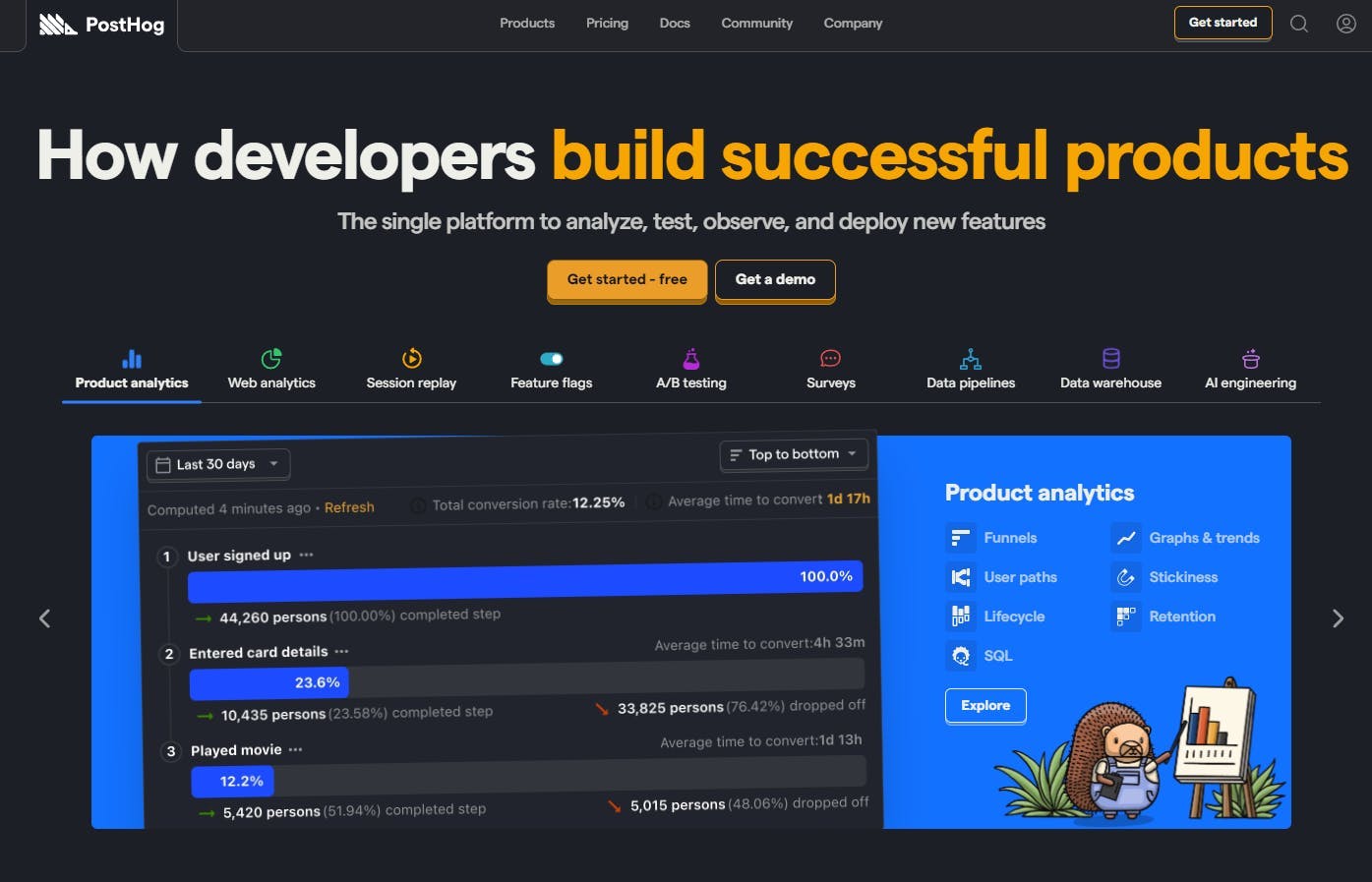 PostHog is an open-source platform for product analytics, offering features like event tracking, user behavior analysis, and feature flagging. It provides full visibility into how users interact with your product, enabling data-driven decision-making.